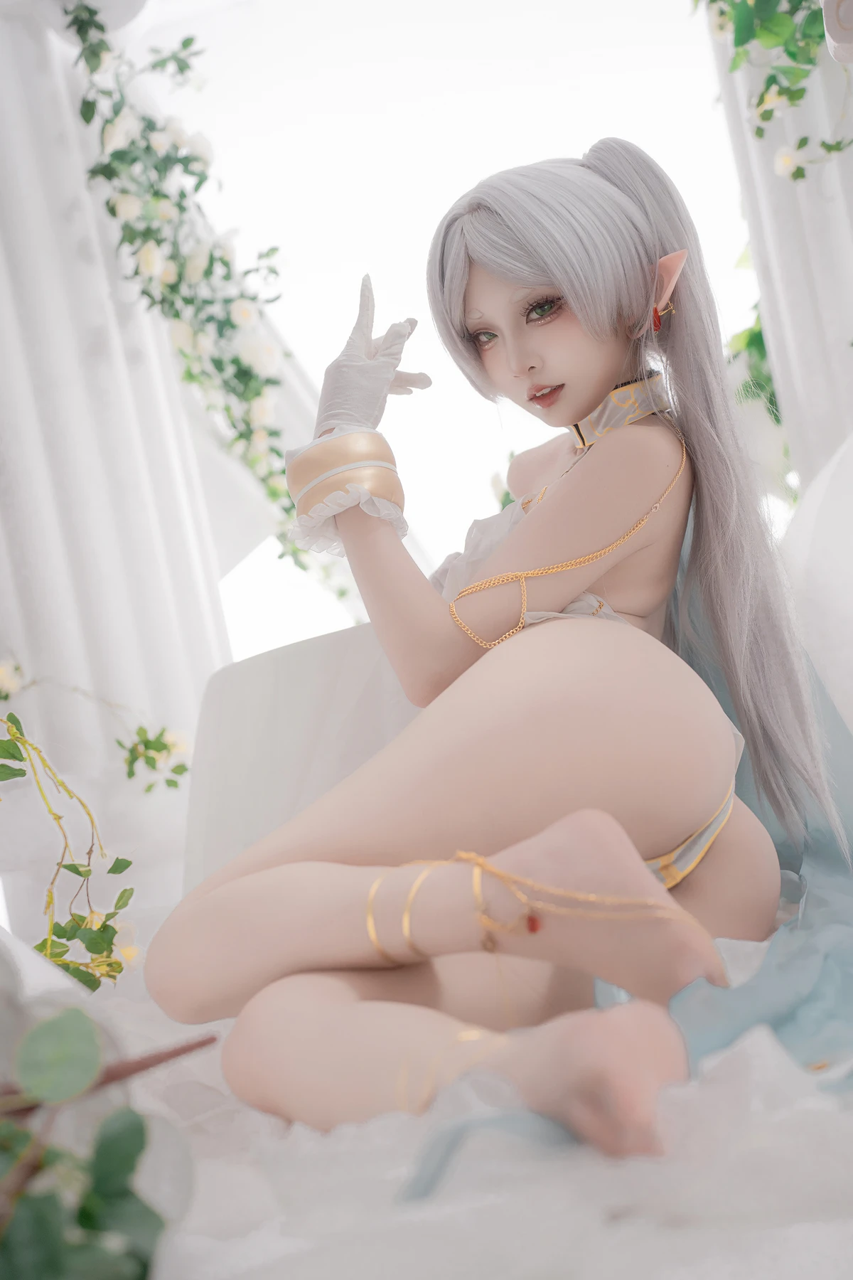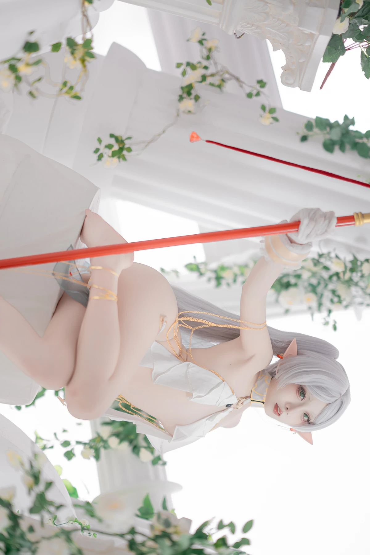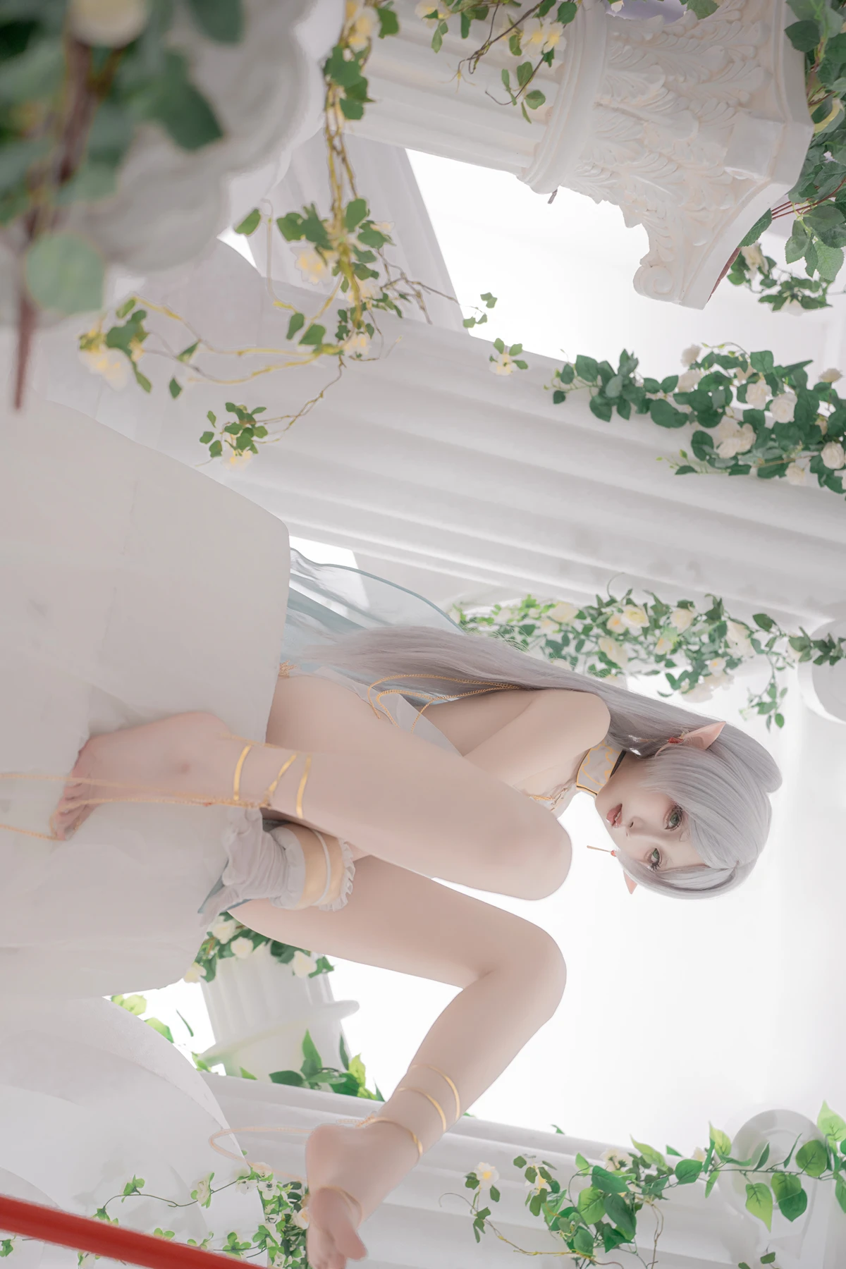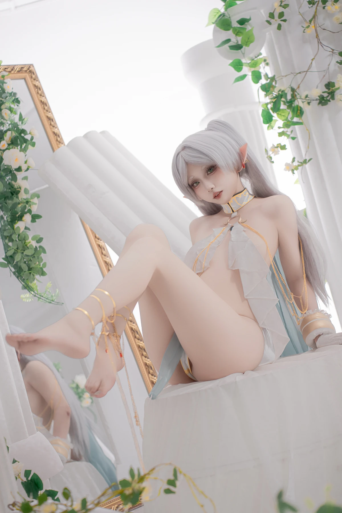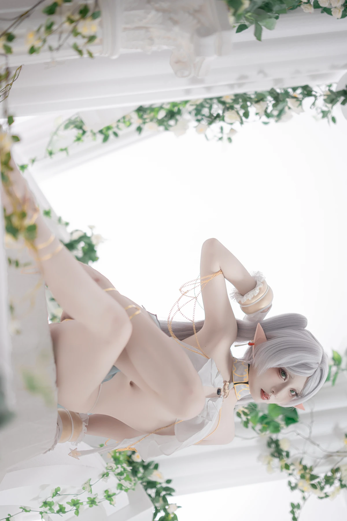 This photoshoot presents Frieren in a reimagined “dancer” style, giving the character a fresh and vibrant aesthetic while keeping the fantasy theme intact. The outfit incorporates light fabrics, flowing movement elements, and soft magical tones to match the world of the original series.