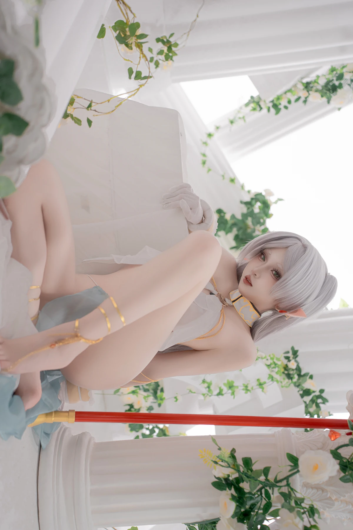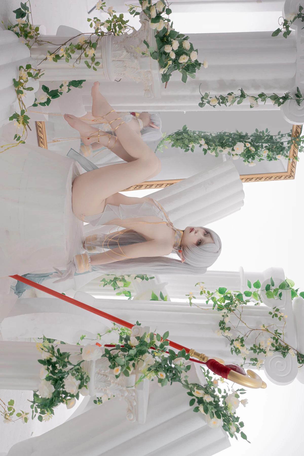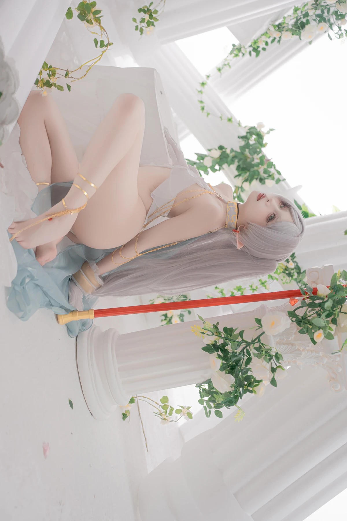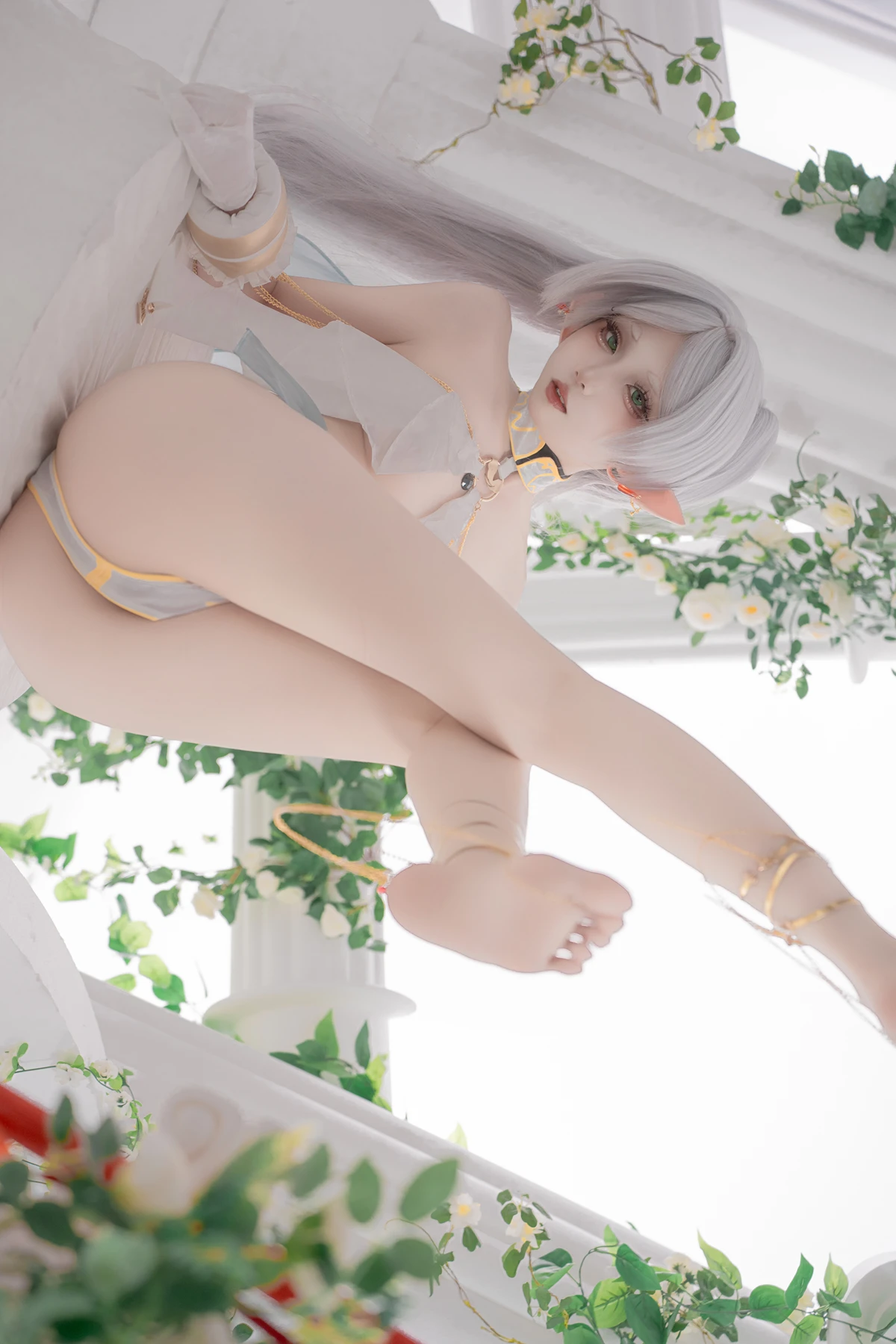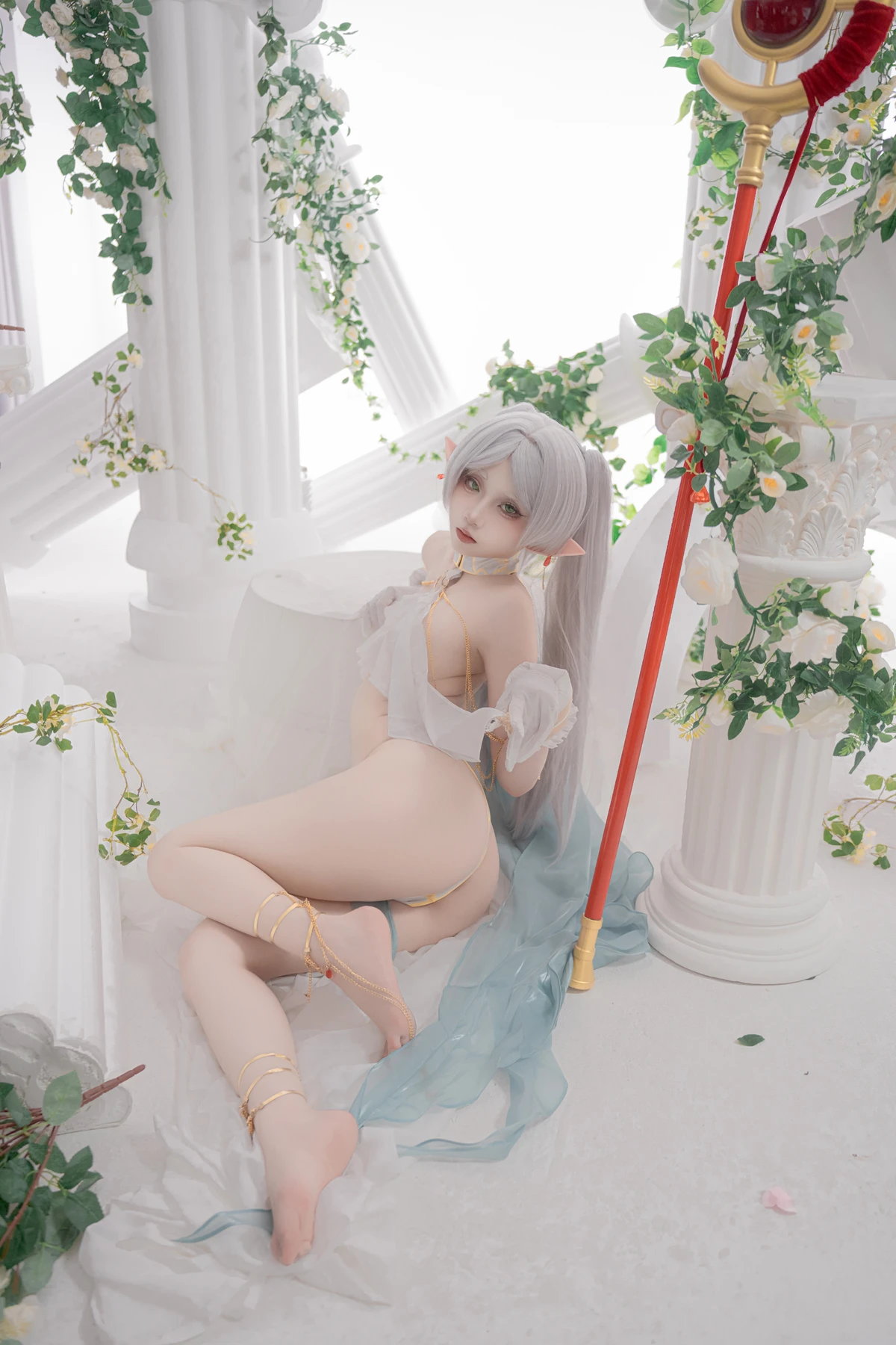 This photoshoot presents Frieren in a reimagined “dancer” style, giving the character a fresh and vibrant aesthetic while keeping the fantasy theme intact. The outfit incorporates light fabrics, flowing movement elements, and soft magical tones to match the world of the original series.