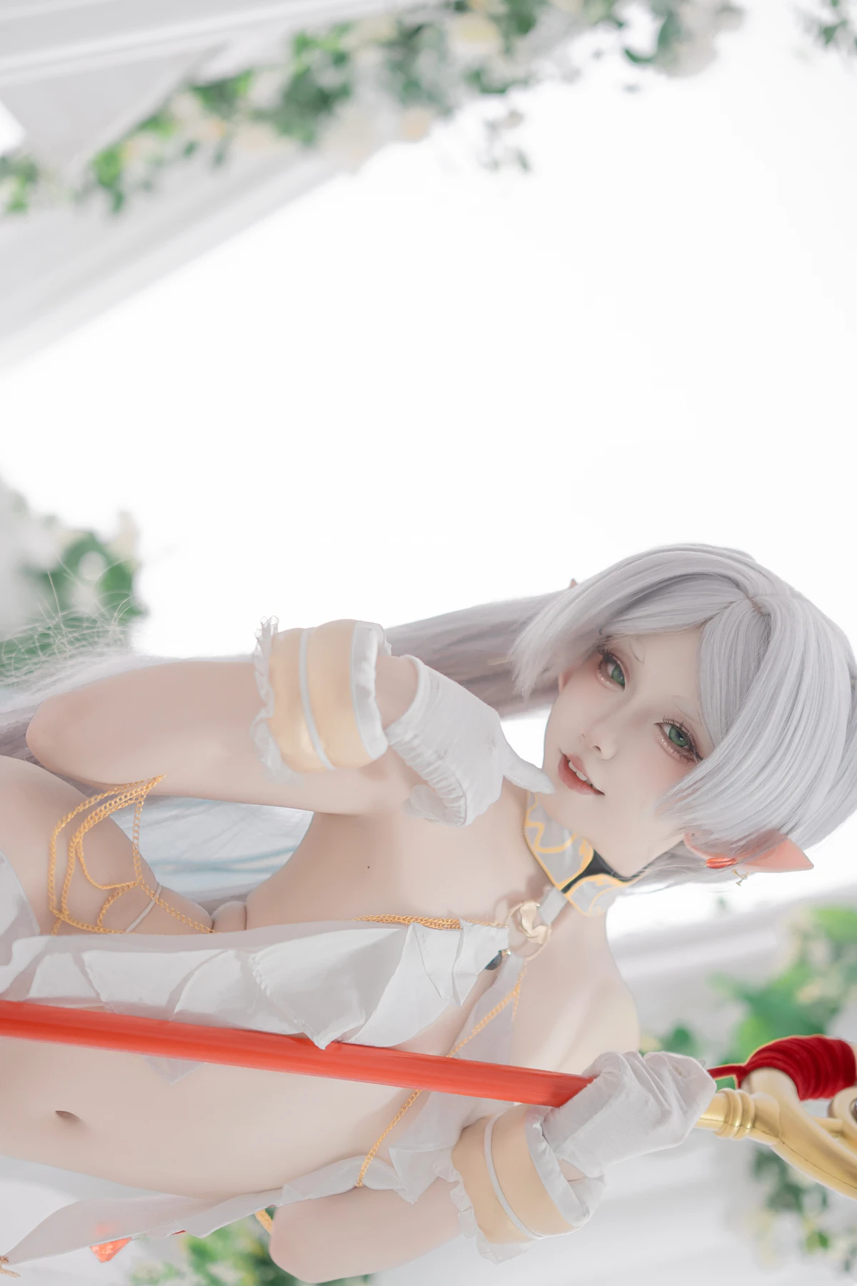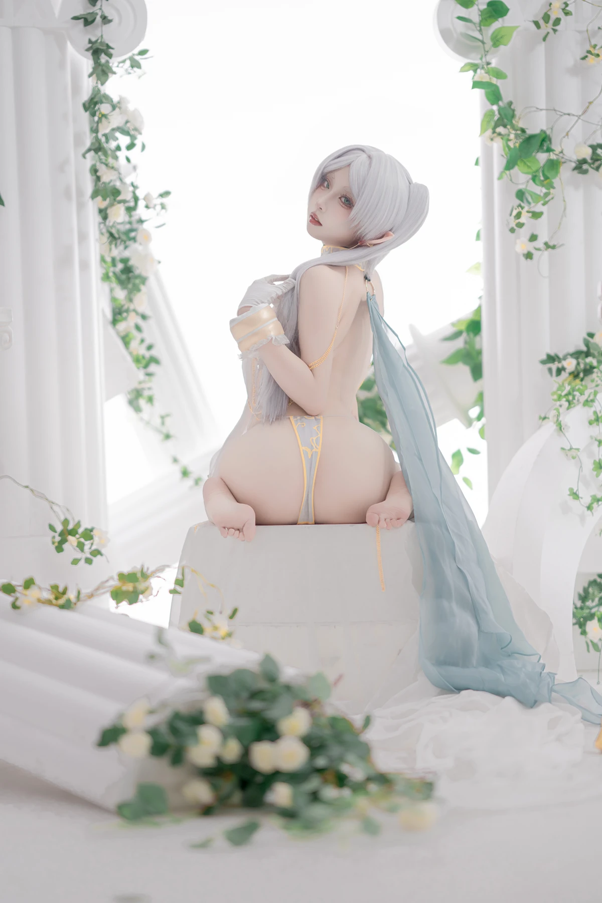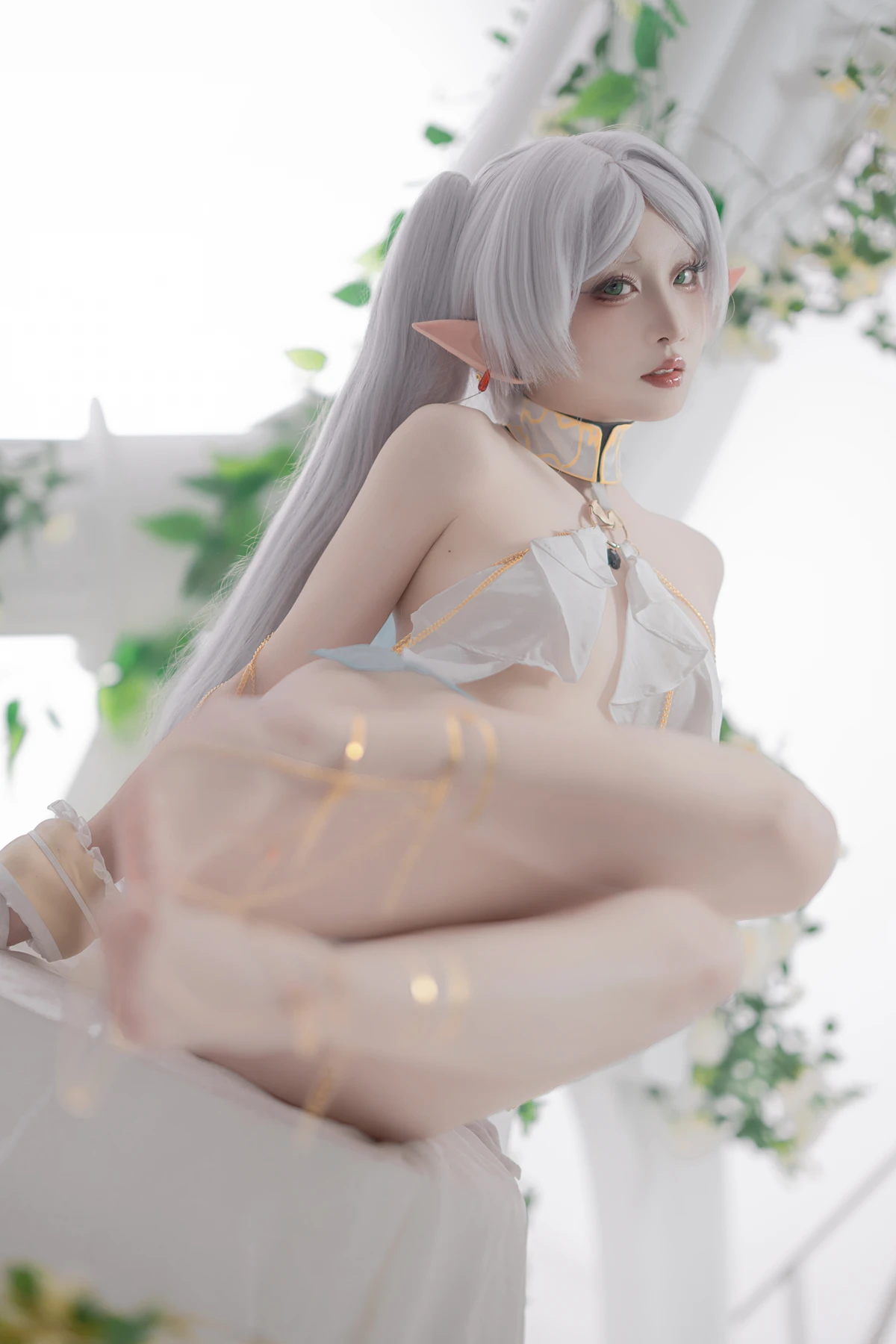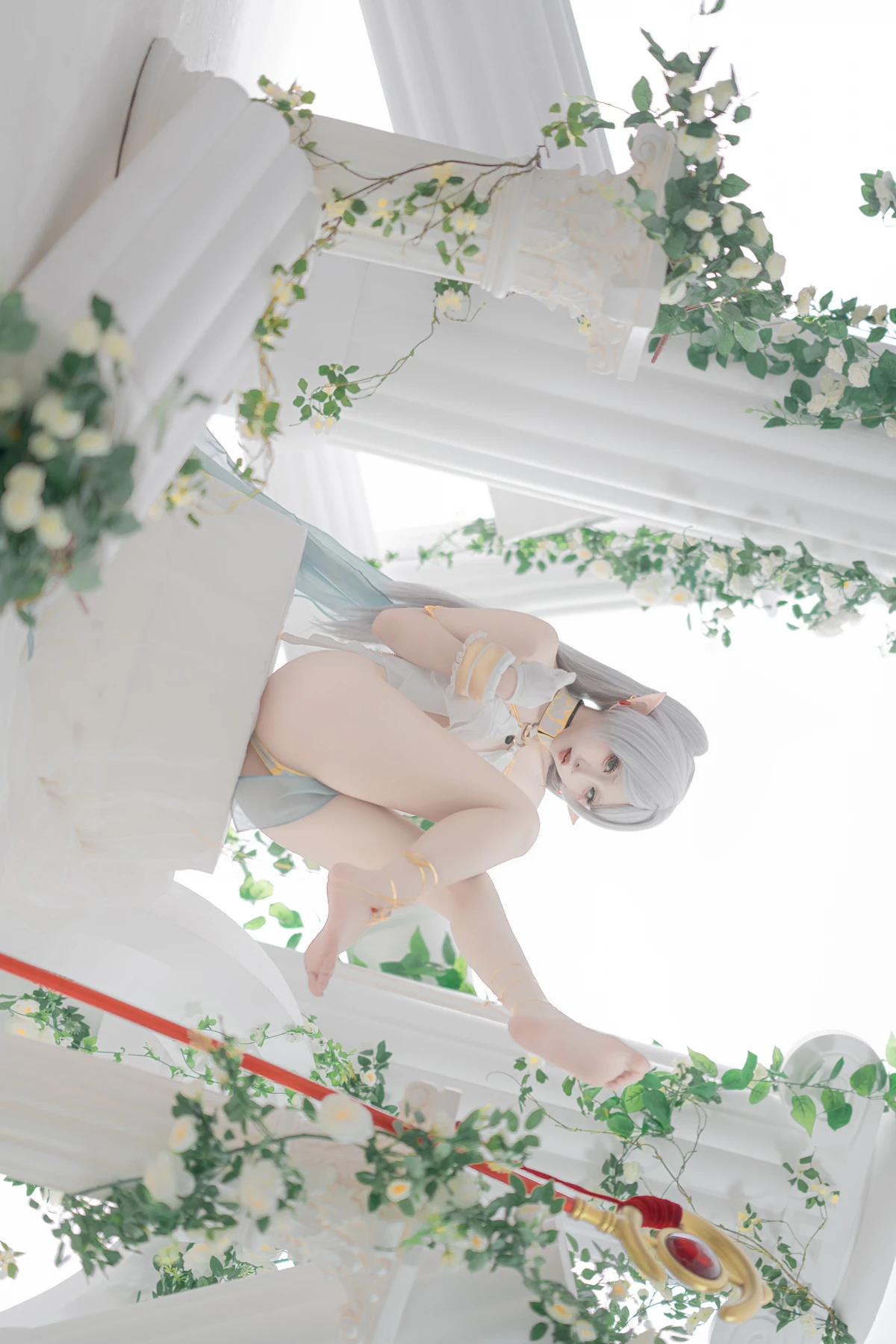 This photoshoot presents Frieren in a reimagined “dancer” style, giving the character a fresh and vibrant aesthetic while keeping the fantasy theme intact. The outfit incorporates light fabrics, flowing movement elements, and soft magical tones to match the world of the original series.