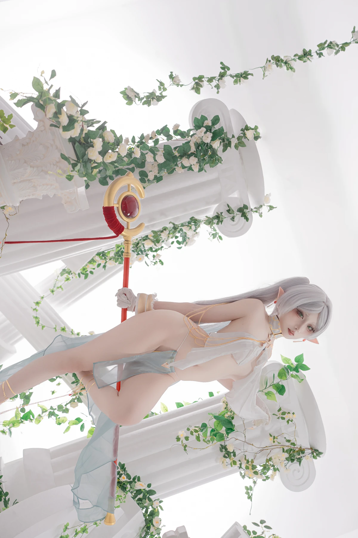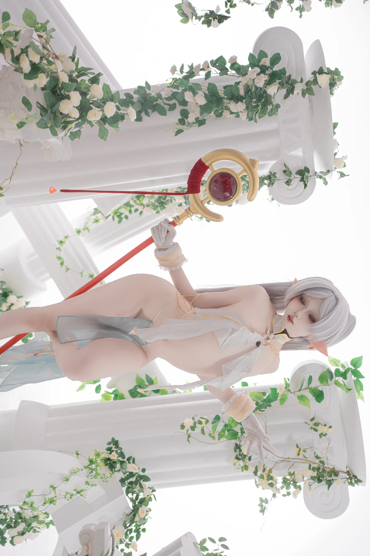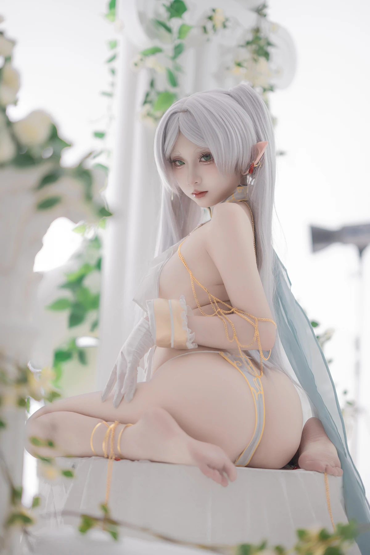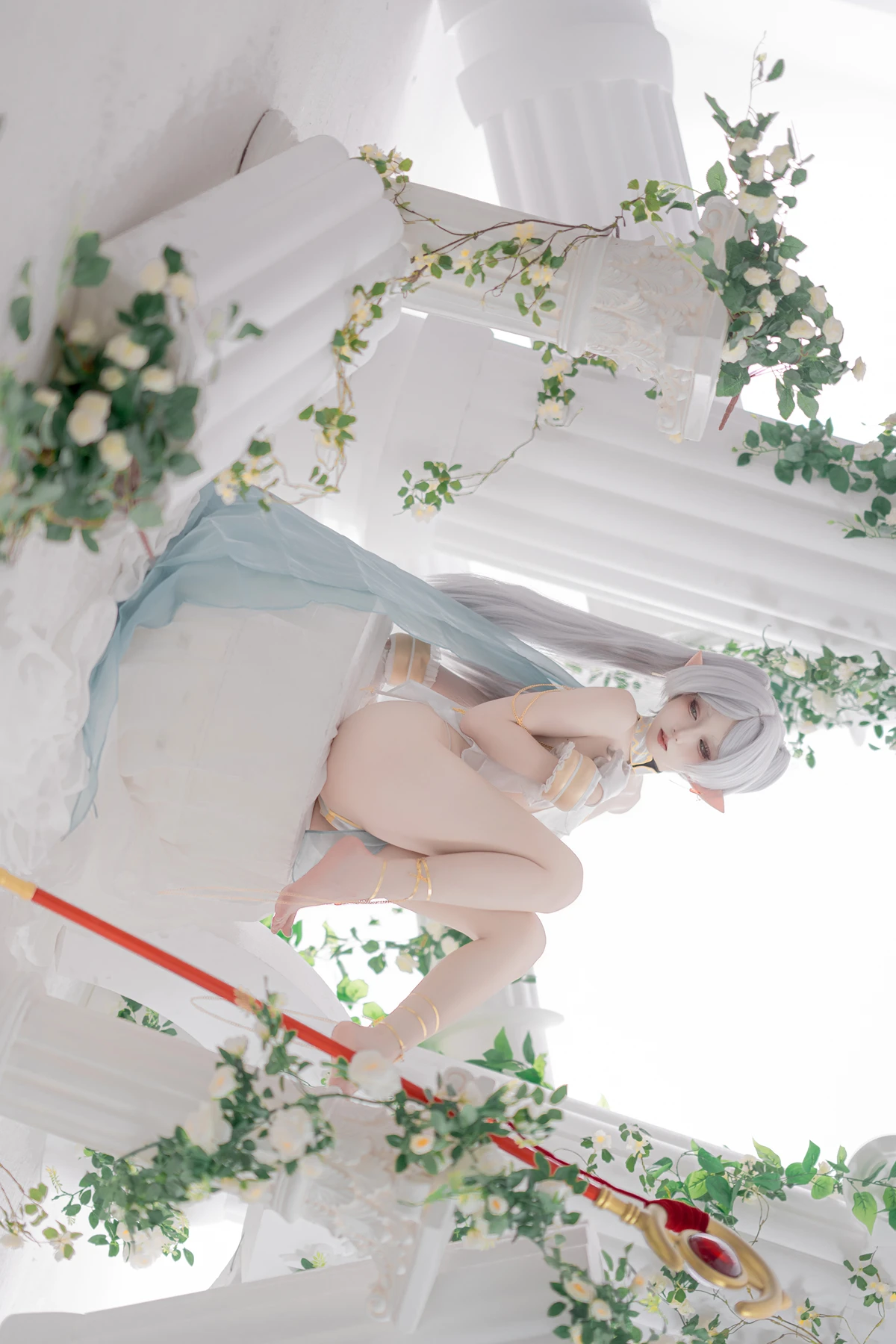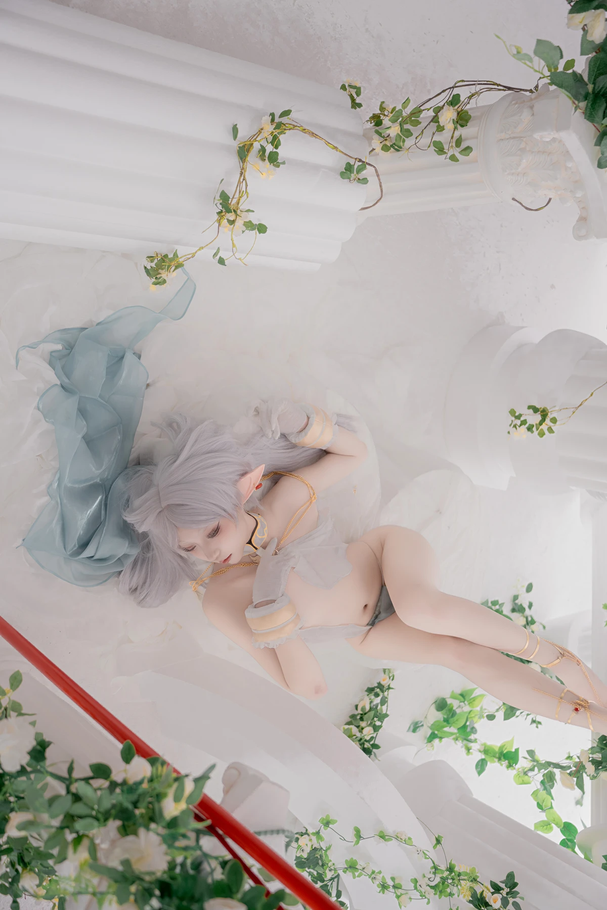 This photoshoot presents Frieren in a reimagined “dancer” style, giving the character a fresh and vibrant aesthetic while keeping the fantasy theme intact. The outfit incorporates light fabrics, flowing movement elements, and soft magical tones to match the world of the original series.