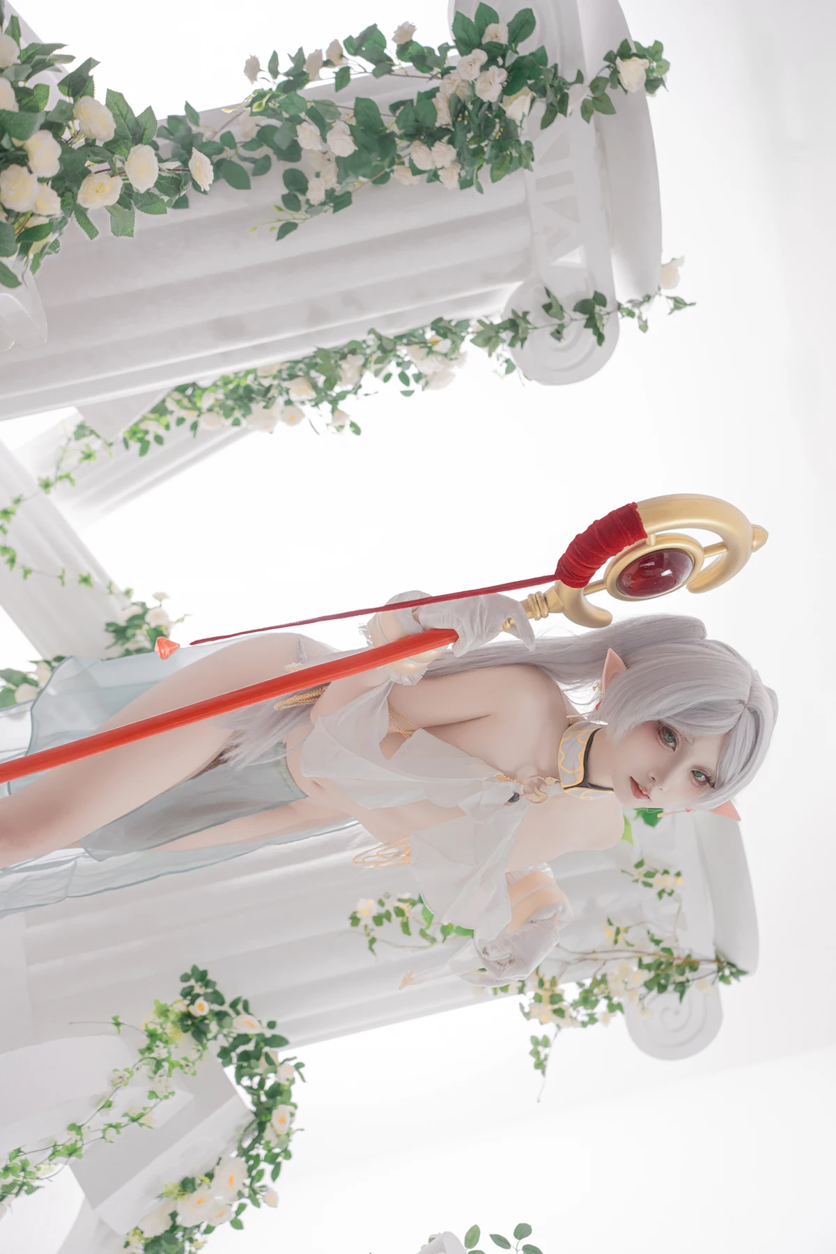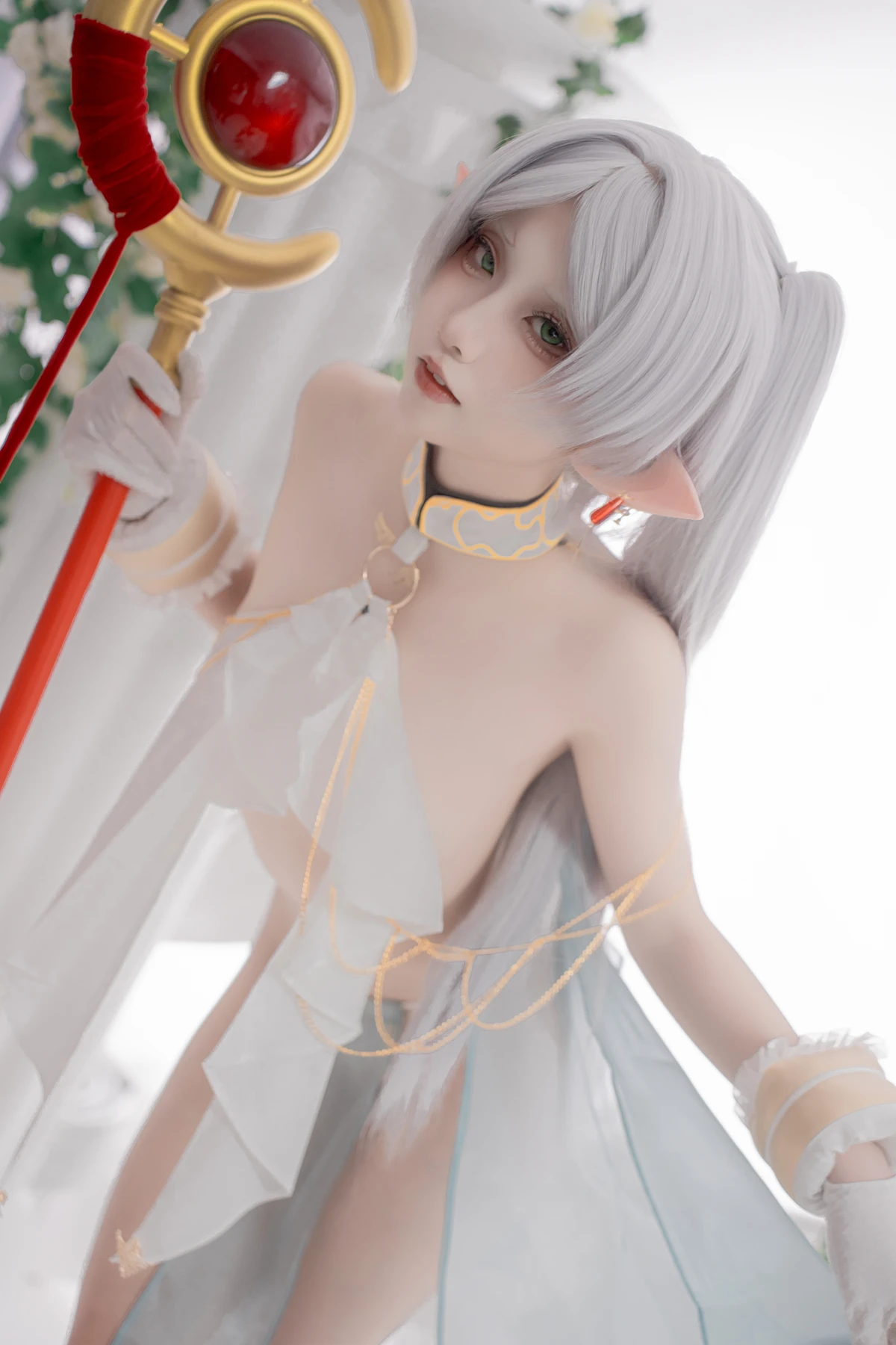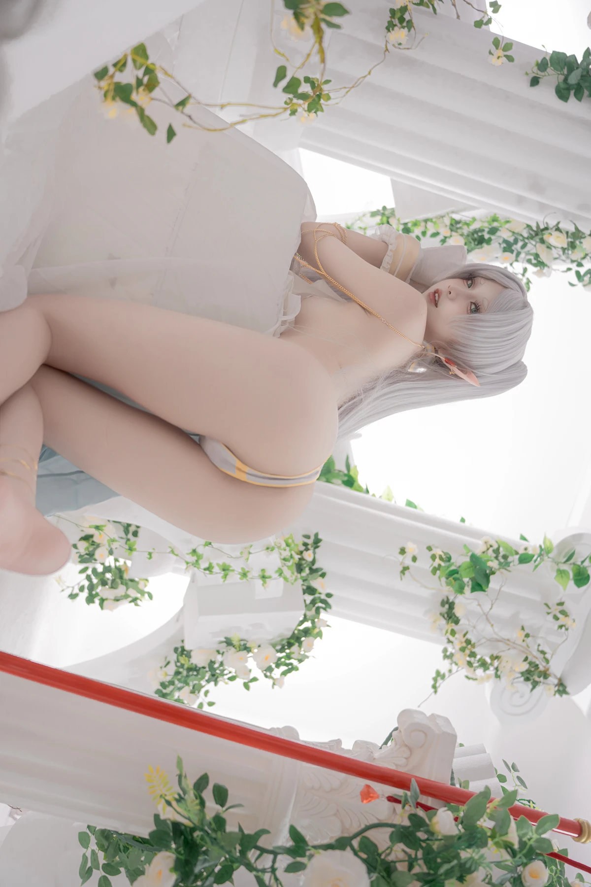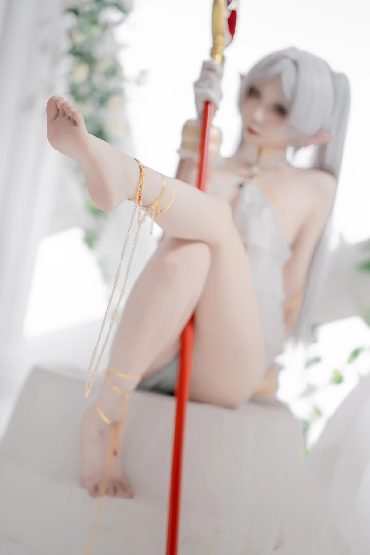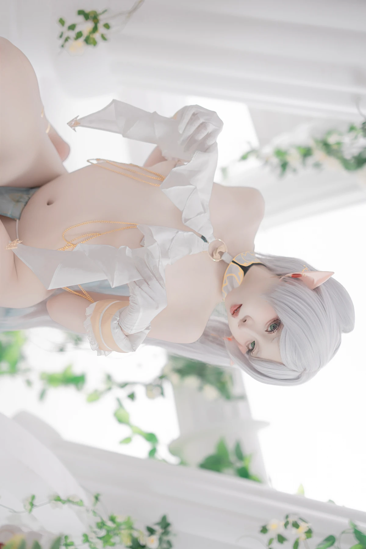 This photoshoot presents Frieren in a reimagined “dancer” style, giving the character a fresh and vibrant aesthetic while keeping the fantasy theme intact. The outfit incorporates light fabrics, flowing movement elements, and soft magical tones to match the world of the original series.
